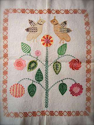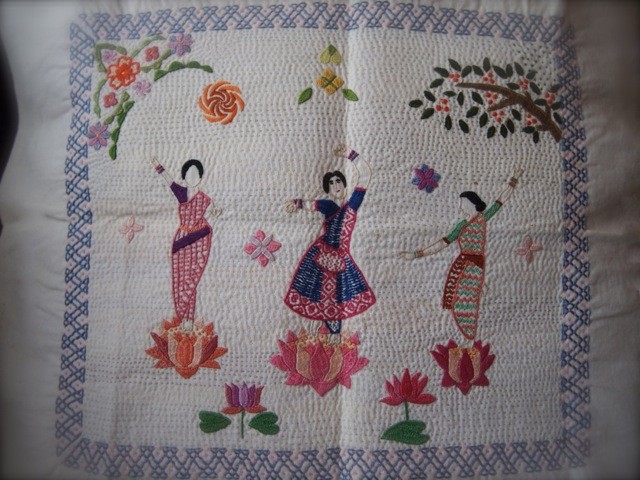 ノクシカタとは ベンガル語で「ノクシ」は『縫うこと』、「カタ」は『布』ということで、「ノクシカタ」は手刺繍を施した布という意味です。 ノクシカタはバングラデシュの伝統手工芸品ですが、もともとは母から娘へ伝えられる家庭内の日用品でした。